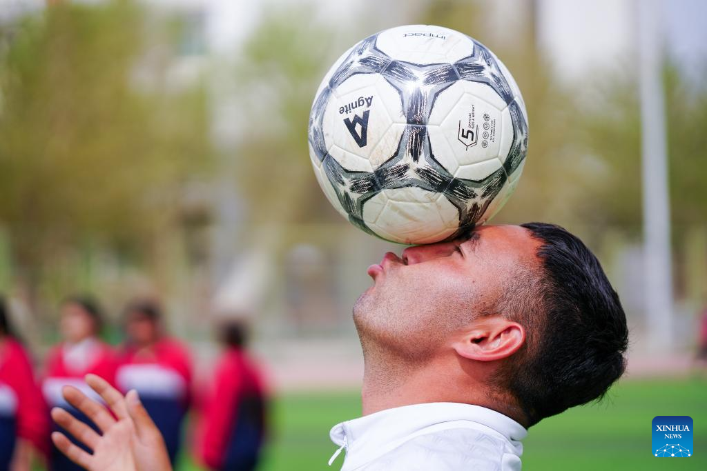 Rozaji Amatjan, Coach of the U13 girls' football team of Artux City, shows a football skill during a training session in Artux City, Kizilsu Kirgiz Autonomous Prefecture in northwest China's Xinjiang Uygur Autonomous Region, April 14, 2025. (Xinhua/Xu Hongyan)