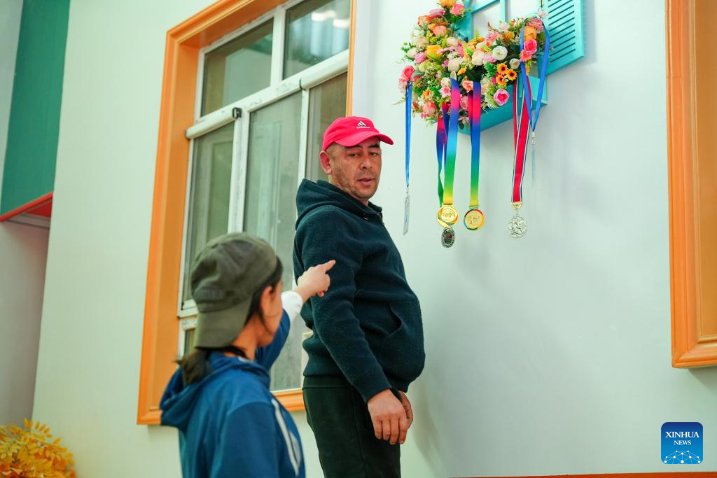 Nafisa Abuduwali (L), a member of the U13 girls' football team of Artux City, points at her medals to her father in Artux City, Kizilsu Kirgiz Autonomous Prefecture in northwest China's Xinjiang Uygur Autonomous Region, April 13, 2025. (Xinhua/Xu Hongyan)