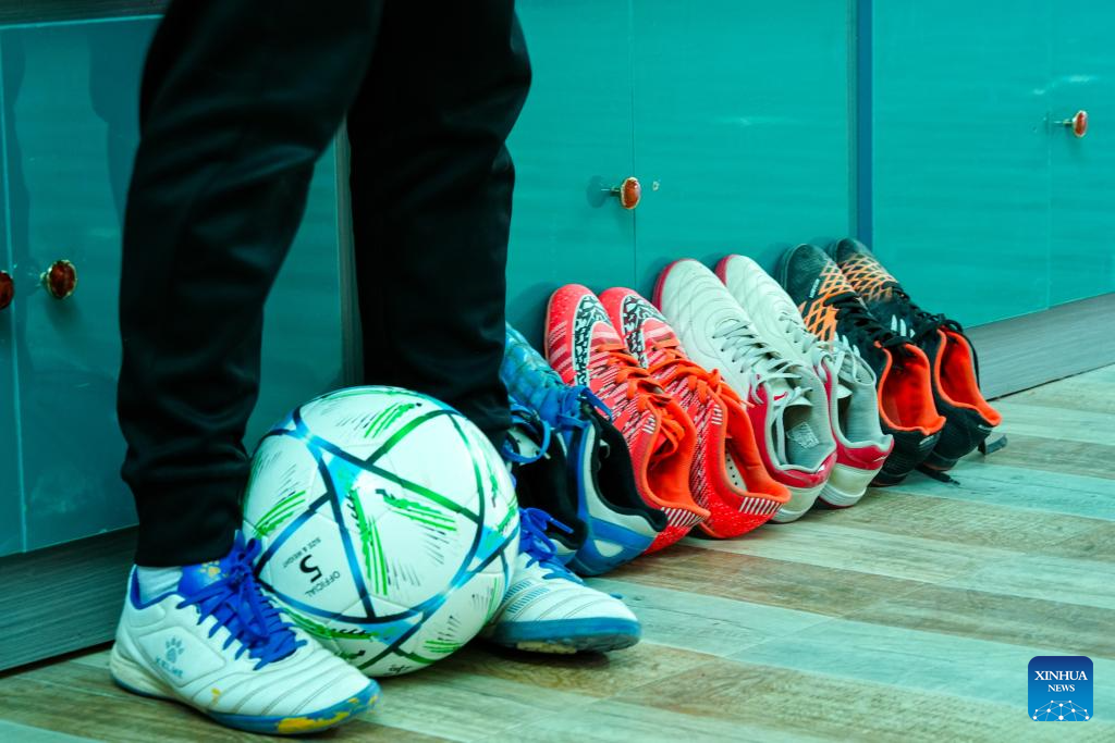 Nafisa Abuduwali, a member of the U13 girls' football team of Artux City, shows her football shoes in Artux City, Kizilsu Kirgiz Autonomous Prefecture in northwest China's Xinjiang Uygur Autonomous Region, April 13, 2025. (Xinhua/Xu Hongyan)