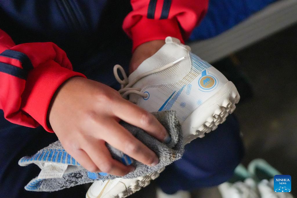 A Girl of the U13 football team of Artux City cleans her football shoe in Artux City, Kizilsu Kirgiz Autonomous Prefecture in northwest China's Xinjiang Uygur Autonomous Region, April 10, 2025. (Xinhua/Xu Hongyan)