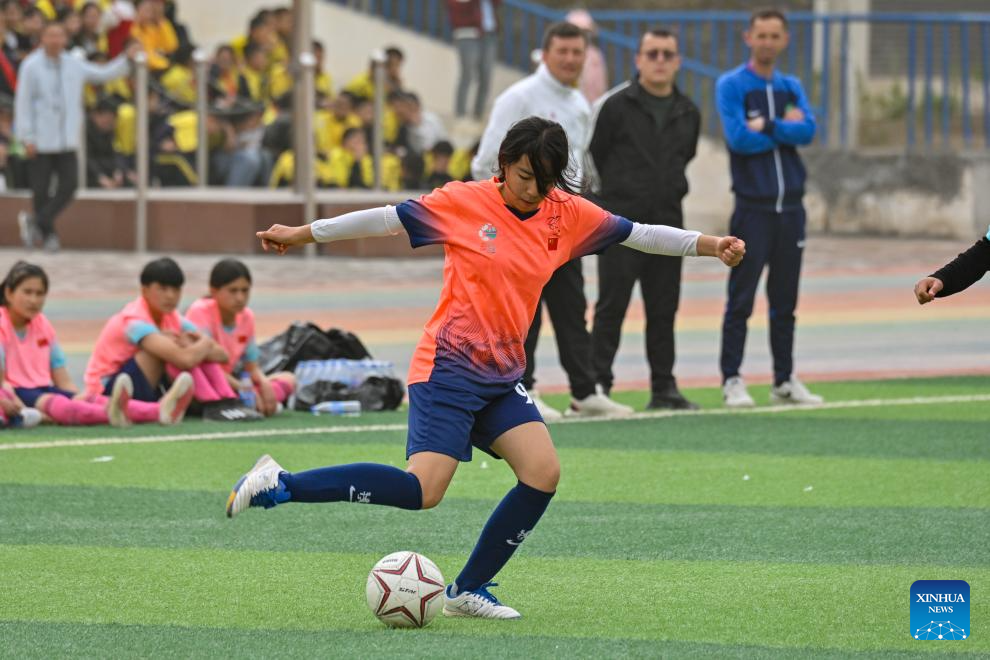 Nafisa Abuduwali, a member of the U13 girls' football team of Artux City, competes during a friendly game in Artux City, Kizilsu Kirgiz Autonomous Prefecture in northwest China's Xinjiang Uygur Autonomous Region, April 12, 2025. (Xinhua/Xu Hongyan)