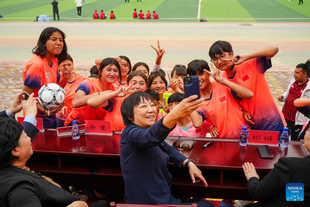 Former football star Sun Wen (C, front), Vice President of the Chinese Football Association, takes selfies with girls of the U13 football team in Artux City, Kizilsu Kirgiz Autonomous Prefecture in northwest China's Xinjiang Uygur Autonomous Region, April 12, 2025. (Xinhua/Xu Hongyan)