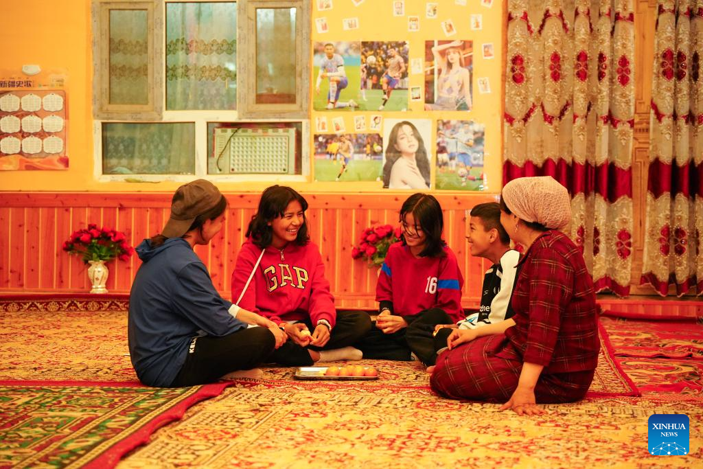 Aniza Abudurusul (2nd L), a member of the U13 girls' football team of Artux City, chats with her famliy and friends at home in Artux City, Kizilsu Kirgiz Autonomous Prefecture in northwest China's Xinjiang Uygur Autonomous Region, April 13, 2025. (Xinhua/Xu Hongyan)