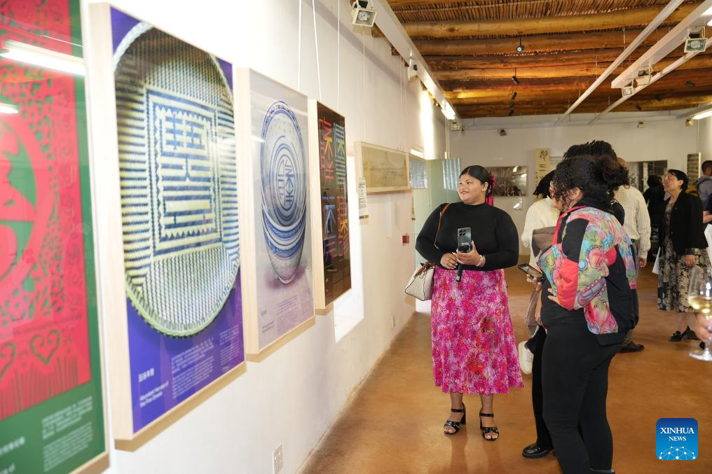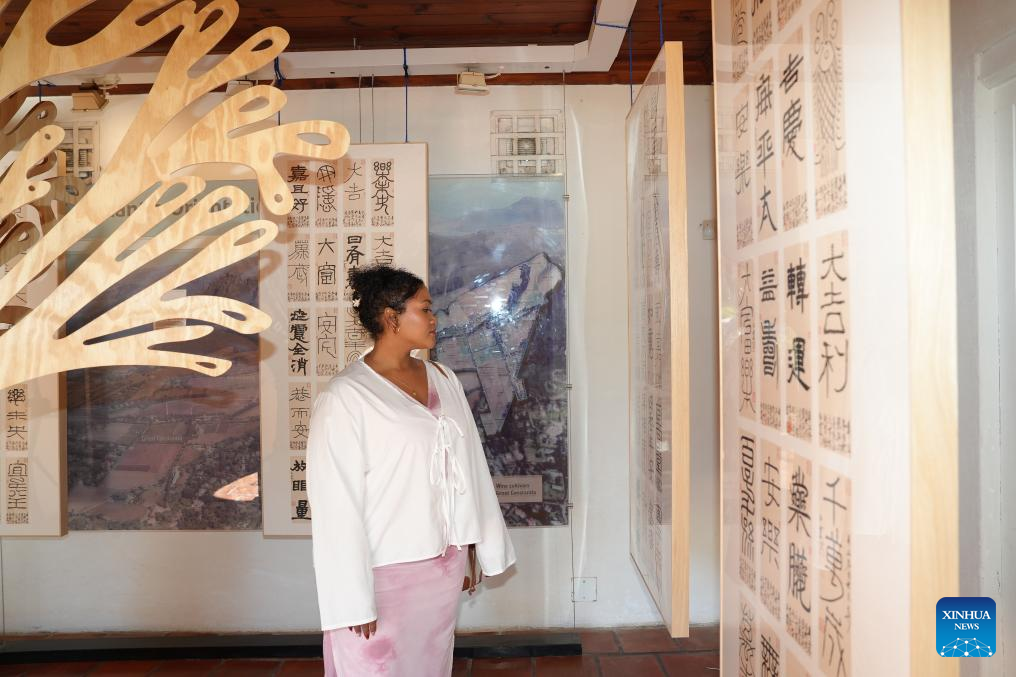 A visitor views an exhibit at "101 Wishes: The Beauty of Chinese Characters" Exhibition at the 2025 International Chinese Language Day event in Cape Town, South Africa, on April 17, 2025. A vibrant celebration to mark the 2025 International Chinese Language Day, themed "Chinese Language: Together for a Bright Future," was held on Thursday at the Iziko Learning Center in Cape Town. (Xinhua/Wang Lei)