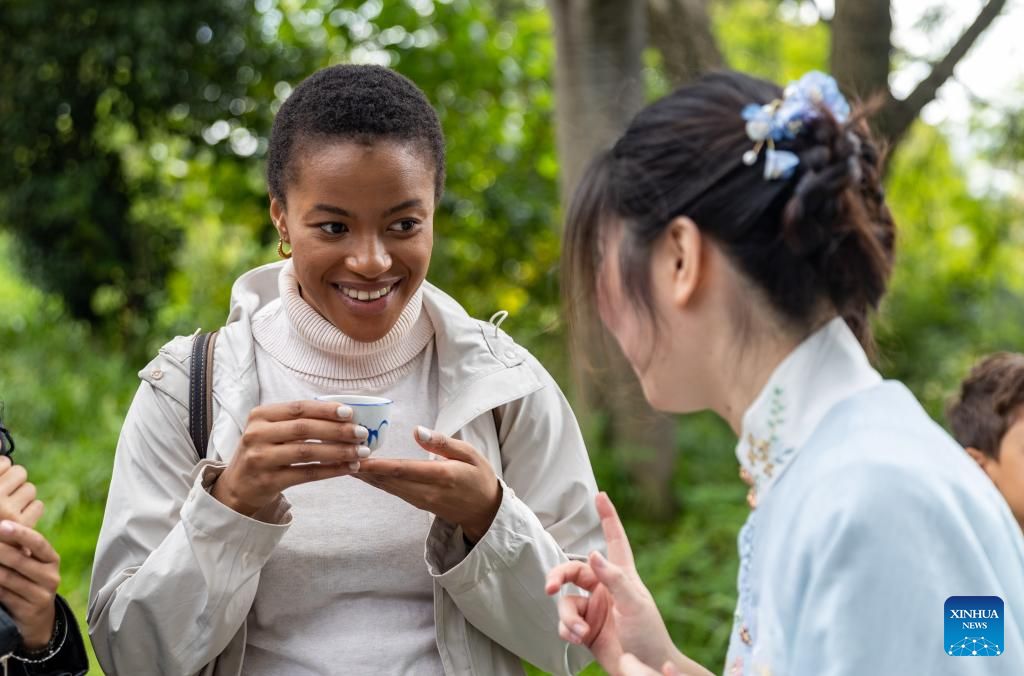 A student tastes Chinese tea during an event celebrating the upcoming International Chinese Language Day at the Confucius Institute at the University of Johannesburg in Johannesburg, South Africa, April 17, 2025. (Xinhua/Zhang Yudong)