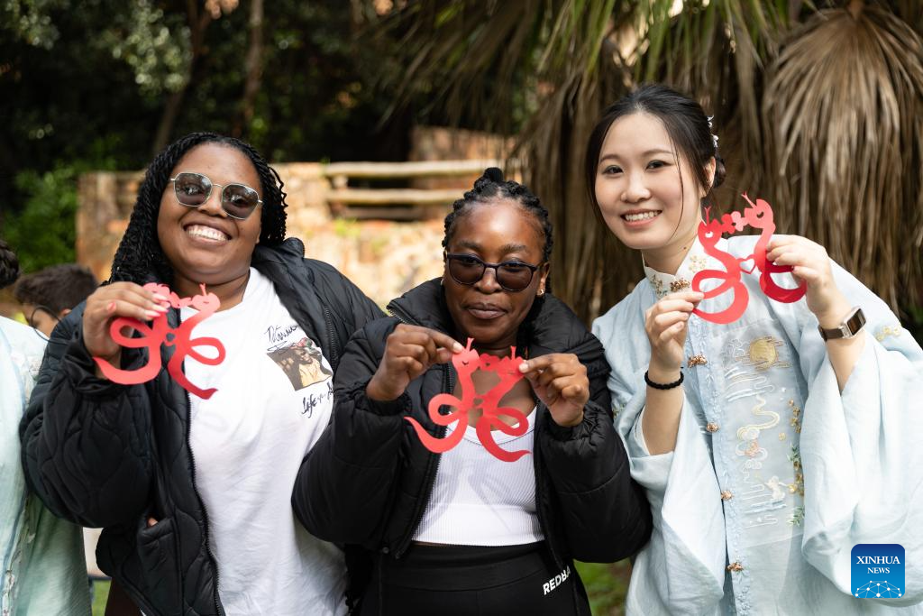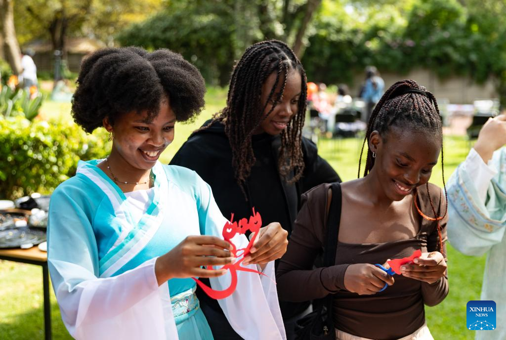 Students and a Confucius Institute volunteer present paper-cutting works during an event celebrating the upcoming International Chinese Language Day at the Confucius Institute at the University of Johannesburg in Johannesburg, South Africa, April 17, 2025. (Xinhua/Zhang Yudong)
