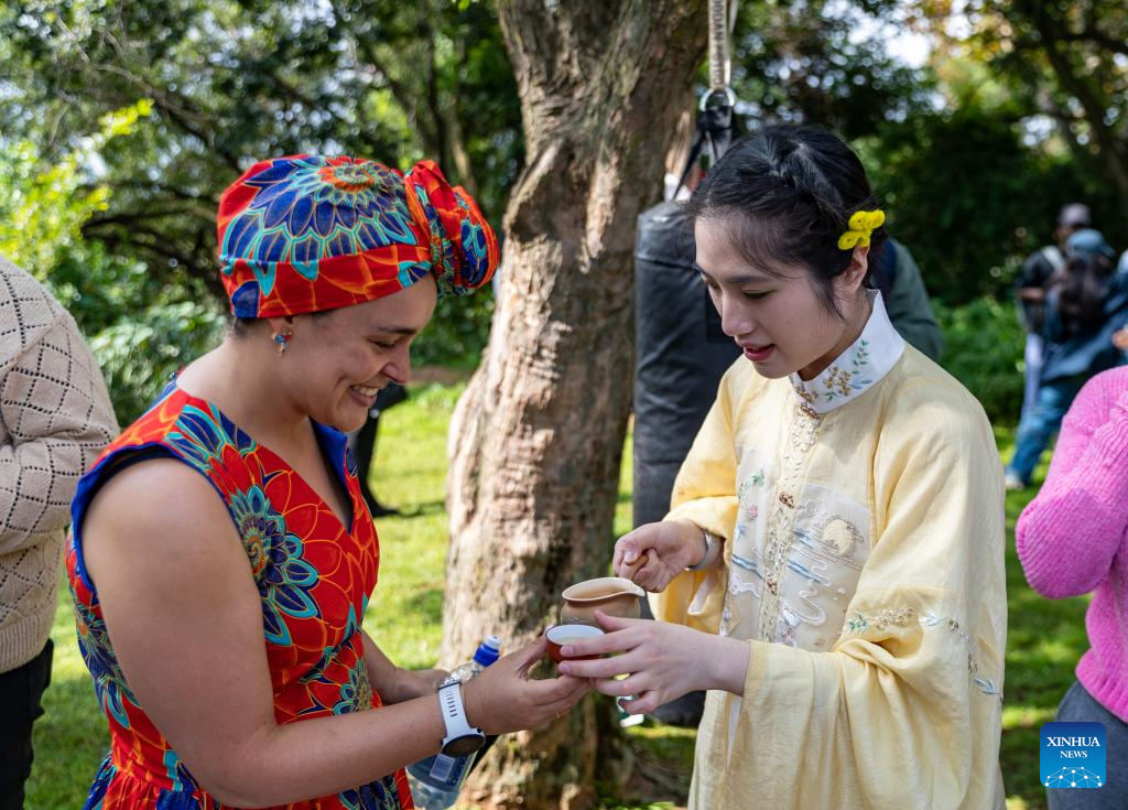 Students taste Chinese tea during an event celebrating the upcoming International Chinese Language Day at the Confucius Institute at the University of Johannesburg in Johannesburg, South Africa, April 17, 2025. (Xinhua/Zhang Yudong)
