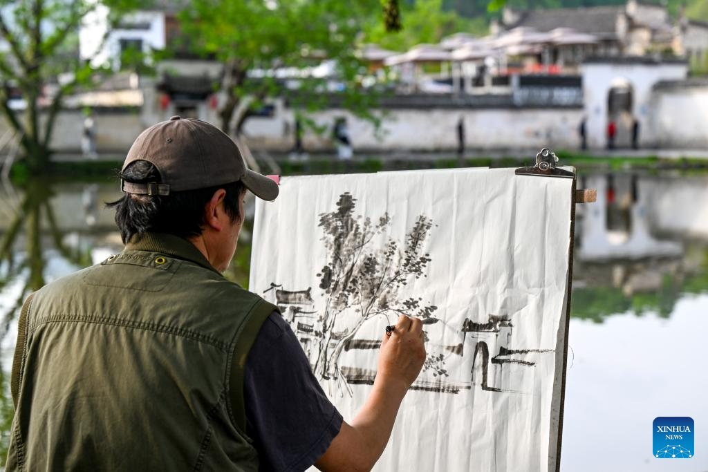 A man paints in Hongcun Village of Yixian County, Huangshan City, east China's Anhui Province, April 17, 2025. (Xinhua/Xu Jiayi)