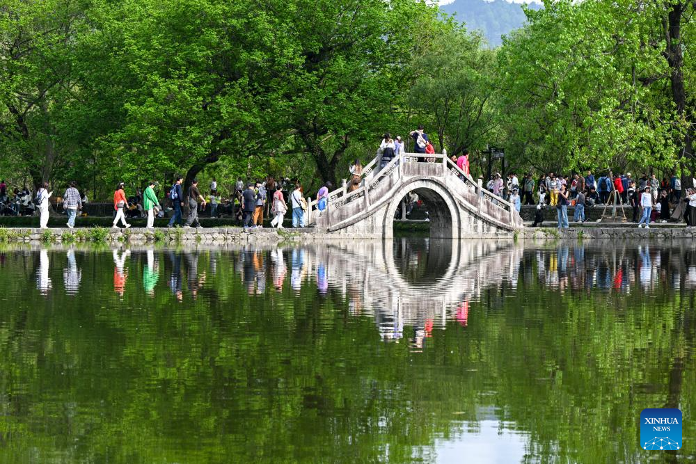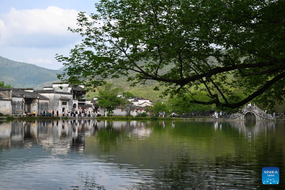 Tourists enjoy the scenery in Hongcun Village of Yixian County, Huangshan City, east China's Anhui Province, April 17, 2025. (Xinhua/Xu Jiayi)