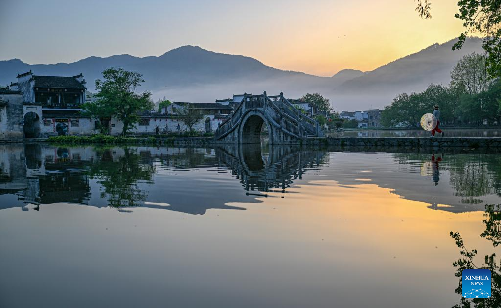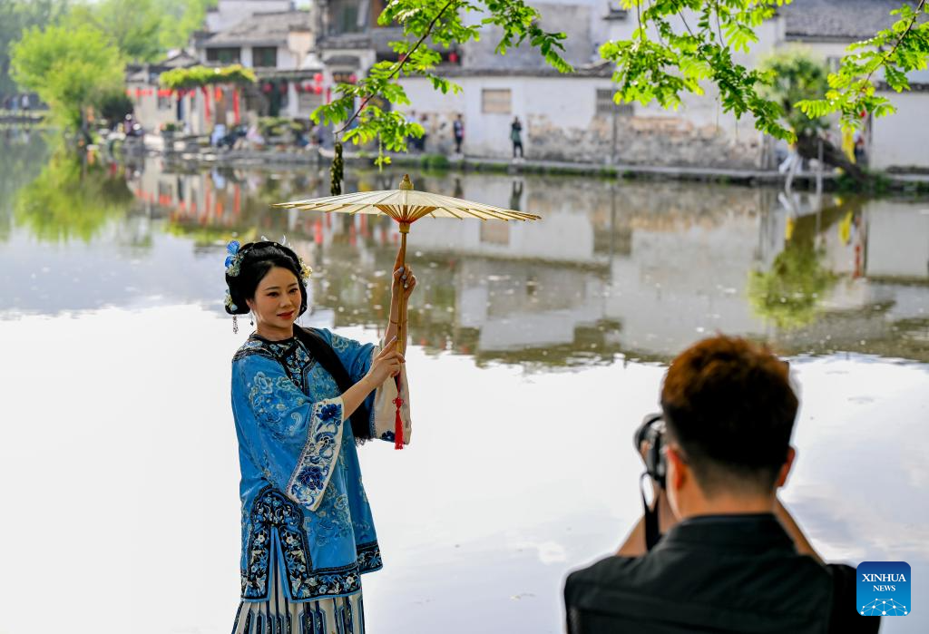 A tourist poses for photos in Hongcun Village of Yixian County, Huangshan City, east China's Anhui Province, April 17, 2025. (Xinhua/Xu Jiayi)