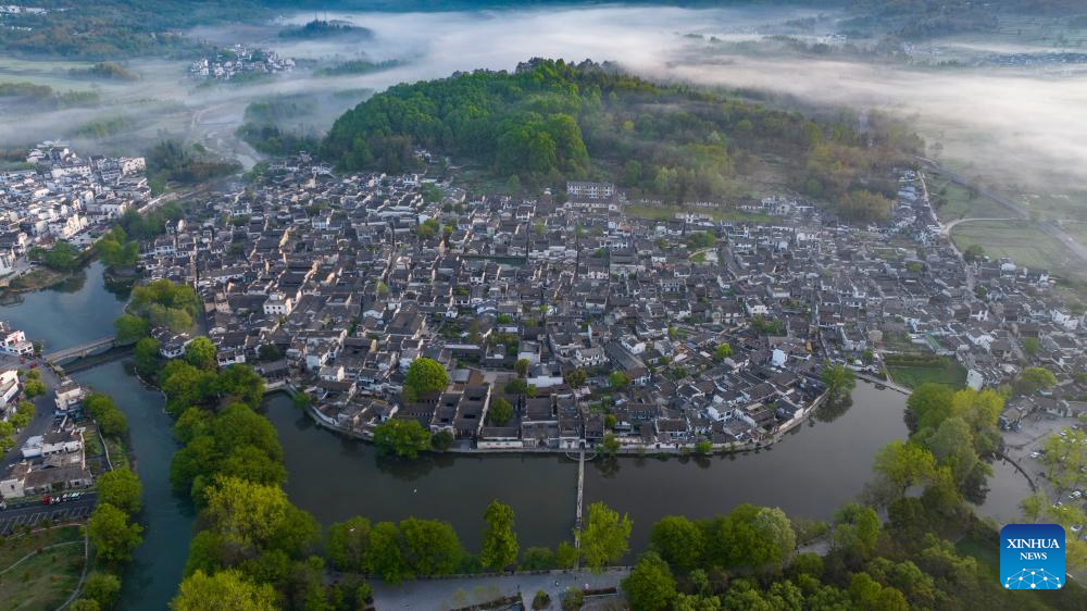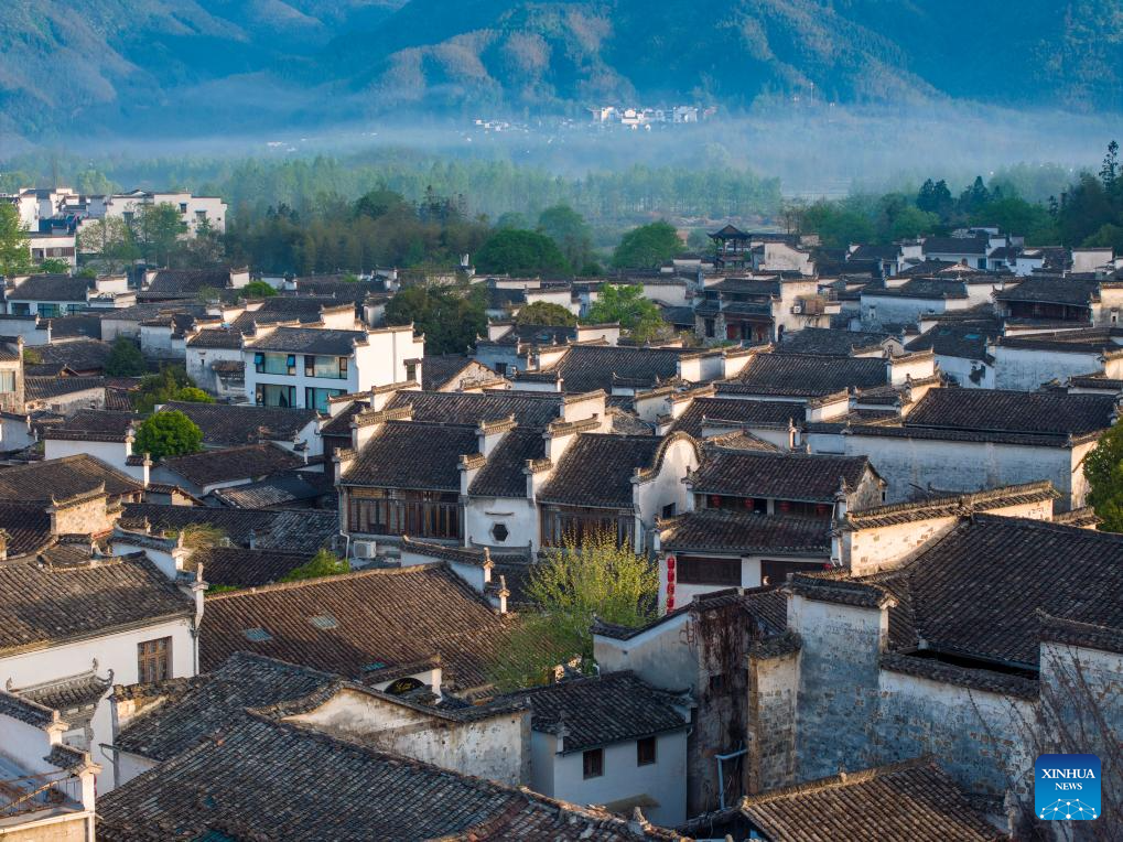 An aerial drone photo taken on April 18, 2025 shows the scenery in Hongcun Village of Yixian County, Huangshan City, east China's Anhui Province. (Photo by Fan Chengzhu/Xinhua)