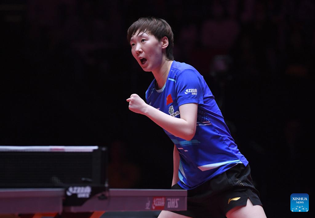 Wang Manyu celebrates scoring during the women's singles quarterfinal match between Kuai Man of China and Wang Manyu of China at the ITTF Men's and Women's World Cup 2025 in Macao, China, April 18, 2025. (Xinhua/Chen Duo)