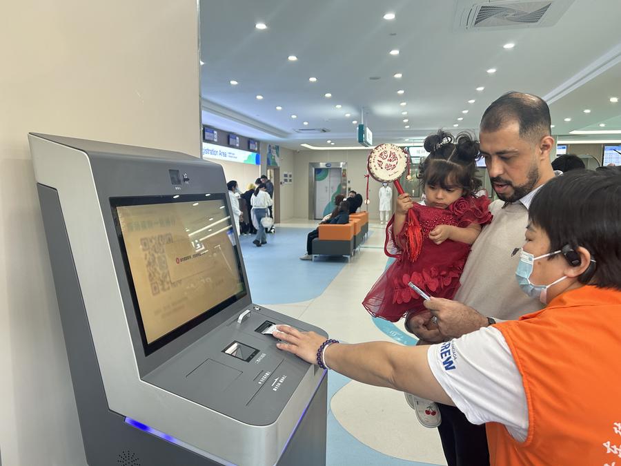 This photo taken with a mobile phone shows a volunteer (R) helping Yemeni businessman Sufyan Marwan Sufyan Mohanmmed take vaccine reservation receipt for his daughter from a machine by scanning a QR code at a community health service center in Yiwu, east China's Zhejiang Province, March 25, 2025. (Xinhua/Huang Xiao)