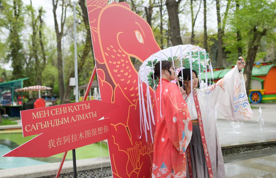 People in costumes with Chinese elements take selfies at the 2025 International Chinese Language Day event in Almaty, Kazakhstan, April 19, 2025. (Xinhua/Li Renzi)