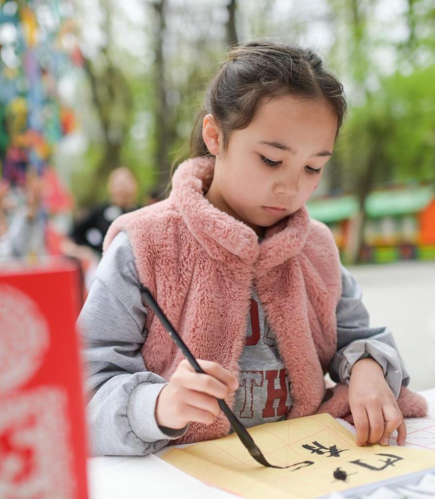 A girl learns to write Chinese characters at the 2025 International Chinese Language Day event in Almaty, Kazakhstan, April 19, 2025. (Xinhua/Li Renzi)