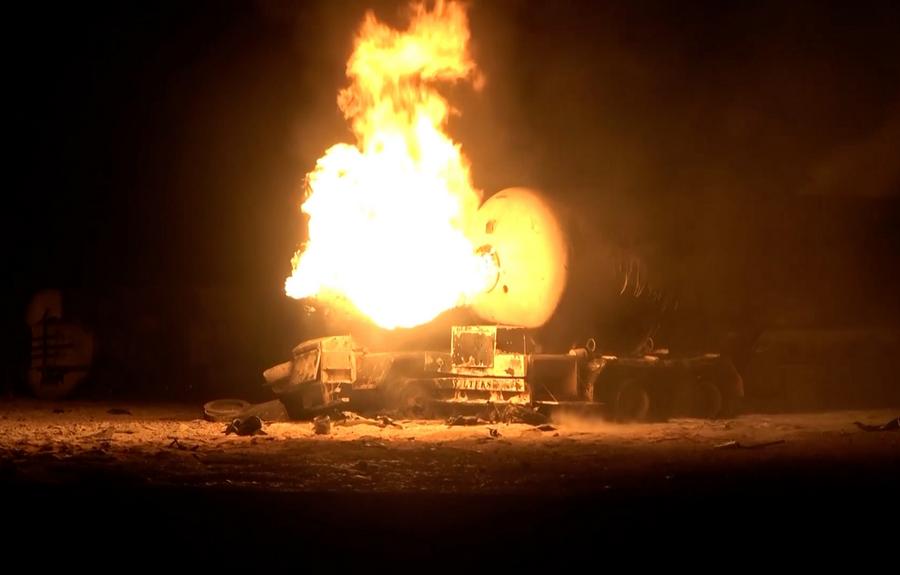 This video screenshot provided by the Houthi Media Center shows a blazing tank truck after U.S. airstrikes on the Yemeni fuel port of Ras Isa in Hodeidah, Yemen, April, 17, 2025. (Xinhua)