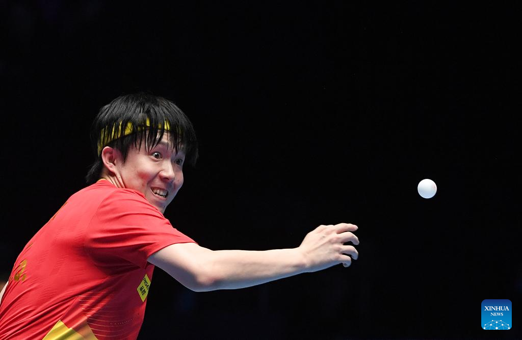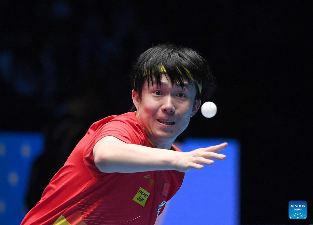 Wang Chuqin hits a return during the men's singles semifinal between Wang Chuqin of China and Hugo Calderano of Brazil at the ITTF Men's and Women's World Cup 2025 in Macao, China, April 19, 2025. (Xinhua/Chen Duo)