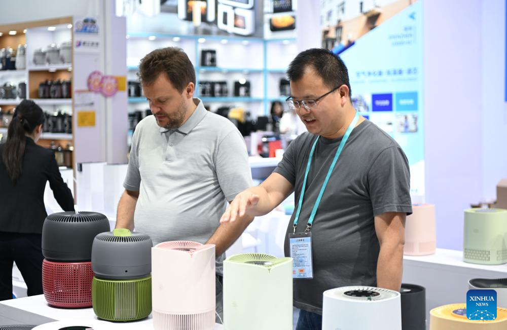 Overseas buyers view air cleaner exhibits during the 137th edition of the China Import and Export Fair in Guangzhou, south China's Guangdong Province, April 18, 2025. The first phase of the 137th edition of the China Import and Export Fair, also known as the Canton Fair, concluded here on Saturday. By April 19, a total of 148,585 overseas buyers from 216 countries and regions had attended the event, marking a 20.2 percent increase compared to the same period last year. (Xinhua/Deng Hua)