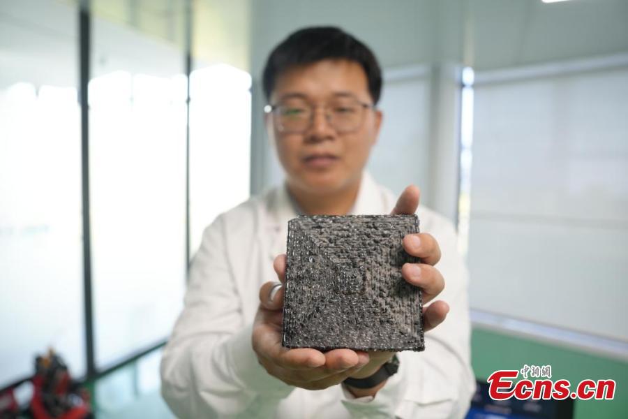 A scientist displays a "lunar brick" at China's deep space exploration laboratory, April 18, 2025. (Photo: China News Service/Zhang Jun)