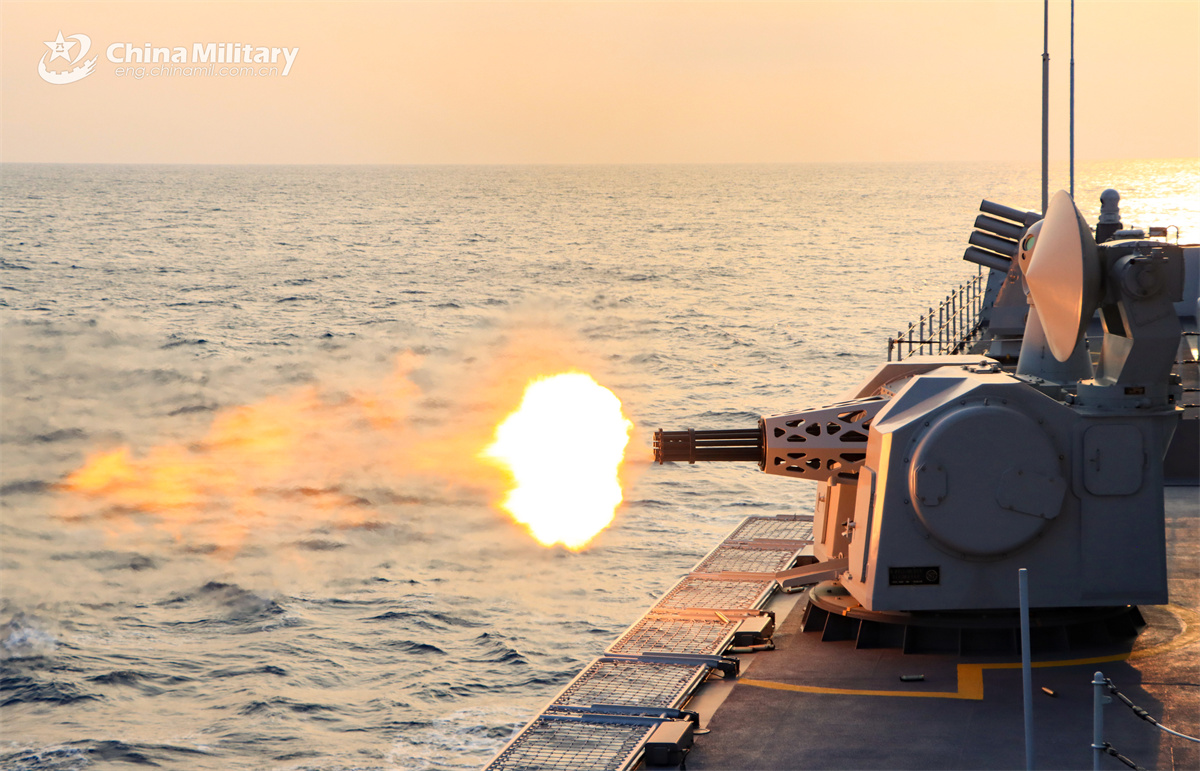 The Type-054A guided-missile frigate Chenzhou (Hull 552) attached to a naval flotilla under the Chinese PLA Southern Theater Command fires its close-in weapon system at simulated maritime targets during a live-fire shooting training exercise on April 13, 2025. (eng.chinamil.com.cn/Photo by Ge Hanqiang)