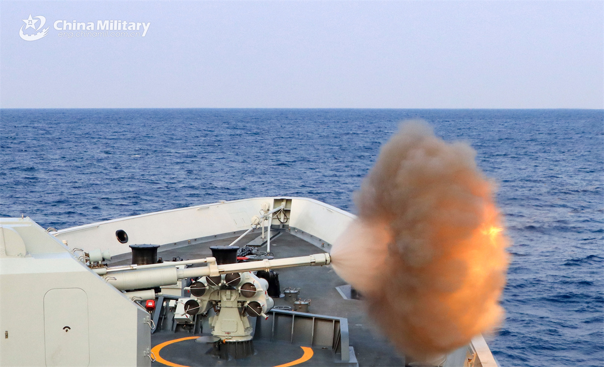 The Type-054A guided-missile frigate Chenzhou (Hull 552) attached to a naval flotilla under the Chinese PLA Southern Theater Command fires its main gun at simulated maritime targets during a live-fire shooting training exercise on April 13, 2025. (eng.chinamil.com.cn/Photo by Ge Hanqiang)
