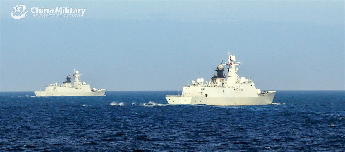 The Type-054A guided-missile frigate Bayannaoer (Hull 551) and Chenzhou (Hull 552) attached to a naval flotilla under the Chinese PLA Southern Theater Command sail toward the designated sea area during a live-fire shooting training exercise on April 13, 2025. (eng.chinamil.com.cn/Photo by Ge Hanqiang)