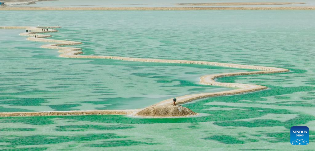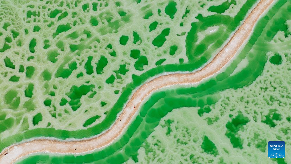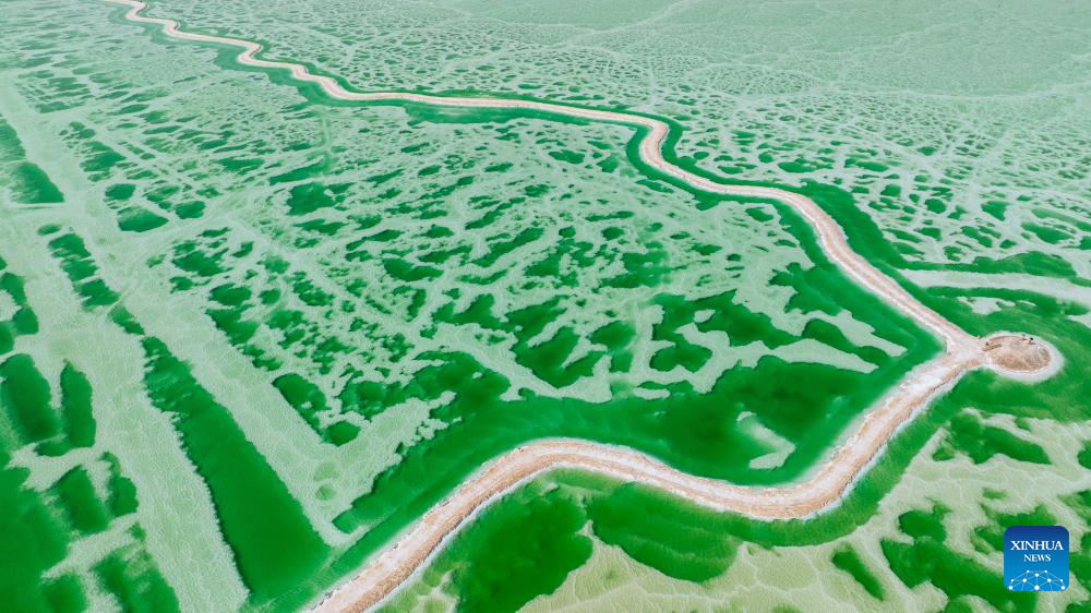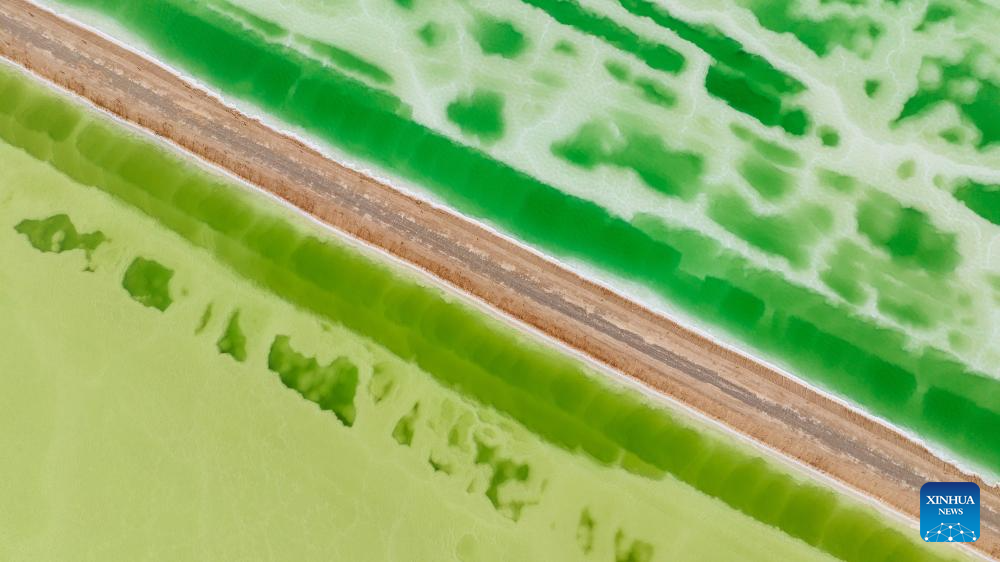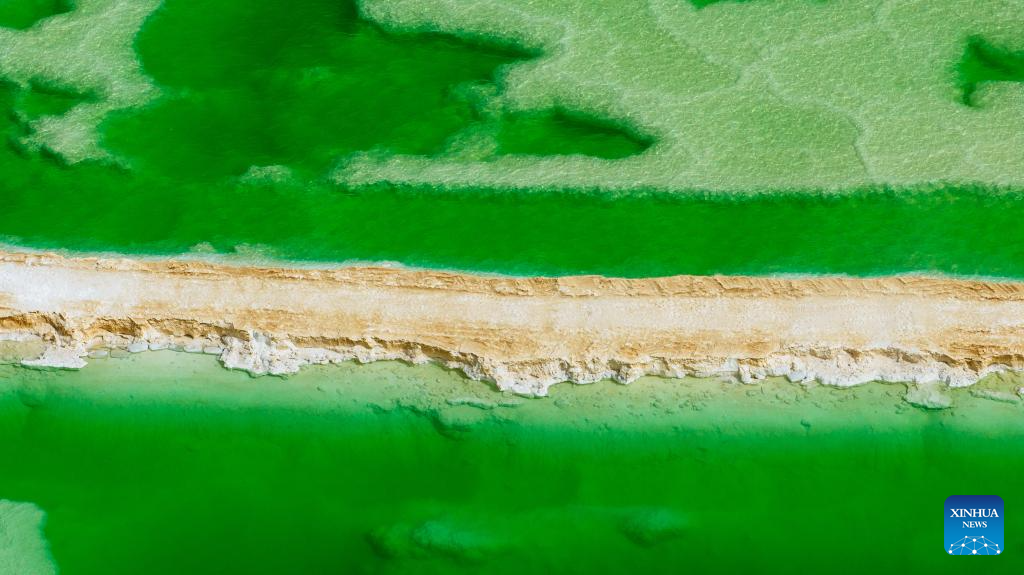 An aerial drone photo taken on April 19, 2025 shows the Jade Lake in Mangya, Haixi Mongolian and Tibetan Autonomous Prefecture of northwest China's Qinghai Province. Because of the difference in its depth and the concentration of minerals in the water, the Jade Lake takes on a number of hues, making it a popular scenic spot. (Xinhua/Wang Bo)
