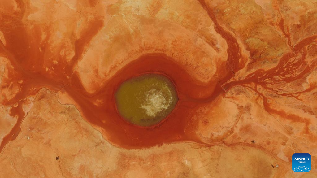 An aerial drone photo taken on April 19, 2025 shows the Aiken Spring in Mangya, Haixi Mongolian and Tibetan Autonomous Prefecture of northwest China's Qinghai Province. Located in northwest China's Qinghai Province, Aiken Spring is dubbed the "Eye of the Earth." This rare geological wonder forms a unique pupil shape from above, with spring water and surrounding deep red sediments resembling an eye embedded in the land. (Xinhua/Wang Bo)