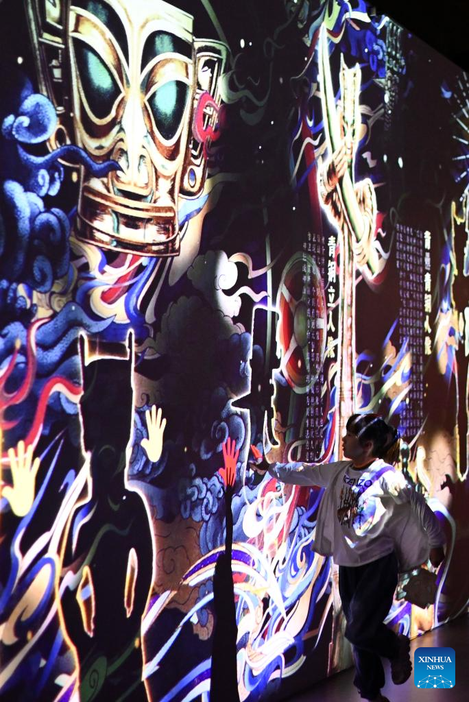 People visit an immersive art exhibition of Sanxingdui at National Maritime Museum of China in north China's Tianjin, April 22, 2025. Through aesthetic design, music, lighting and other digital multimedia means, the recently opened art exhibition provides visitors with an immersive historical space showcasing the art aesthetics, bronze ware culture, sacrificial culture, and spiritual inheritance of the Sanxingdui Ruins. Discovered in the late 1920s in the city of Guanghan, southwest China's Sichuan Province, the Sanxingdui Ruins have been dubbed as one of the world's greatest archaeological finds of the 20th century. (Xinhua/Zhao Zishuo)