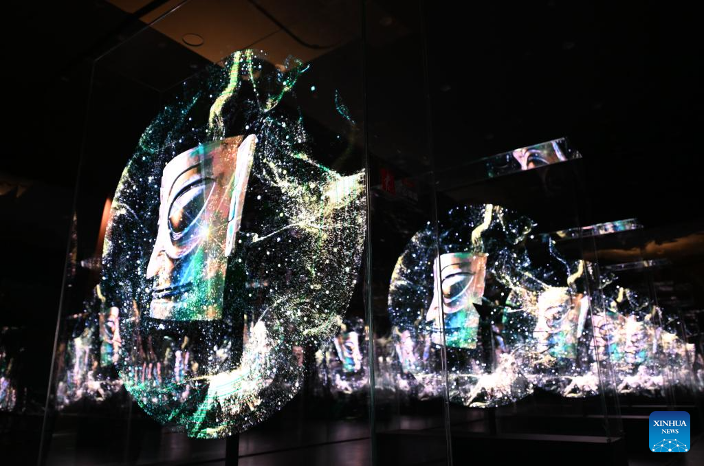 This photo shows a view of the naked-eye holographic exhibition area at an immersive art exhibition of Sanxingdui at National Maritime Museum of China in north China's Tianjin, April 22, 2025. (Xinhua/Zhao Zishuo)