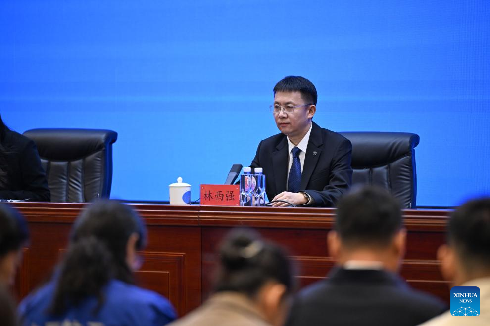 Lin Xiqiang, spokesperson and deputy director of the China Manned Space Agency, speaks during a press conference on the Shenzhou-20 crewed spaceflight mission in Jiuquan Satellite Launch Center in northwest China on April 23, 2025. (Xinhua/Bei He)
