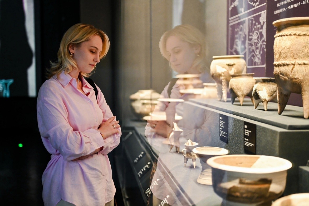 A visitor examines artifacts at the Erlitou Site Museum of the Xia Capital in Luoyang, central China's Henan Province, April 22, 2025. (People's Daily Online/Lu Yang)