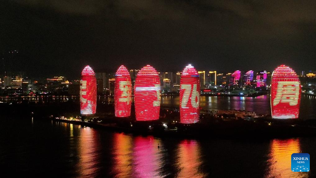 An aerial drone photo taken on April 21, 2025 shows a light show marking the 76th anniversary of the Chinese People's Liberation Army (PLA) Navy in Sanya, south China's Hainan Province. The Chinese People's Liberation Army (PLA) Navy marked its 76th anniversary on Wednesday, reaffirming its commitment to becoming a world-class naval force dedicated to safeguarding both national security and global peace. (Photo by Feng Menglong/Xinhua)