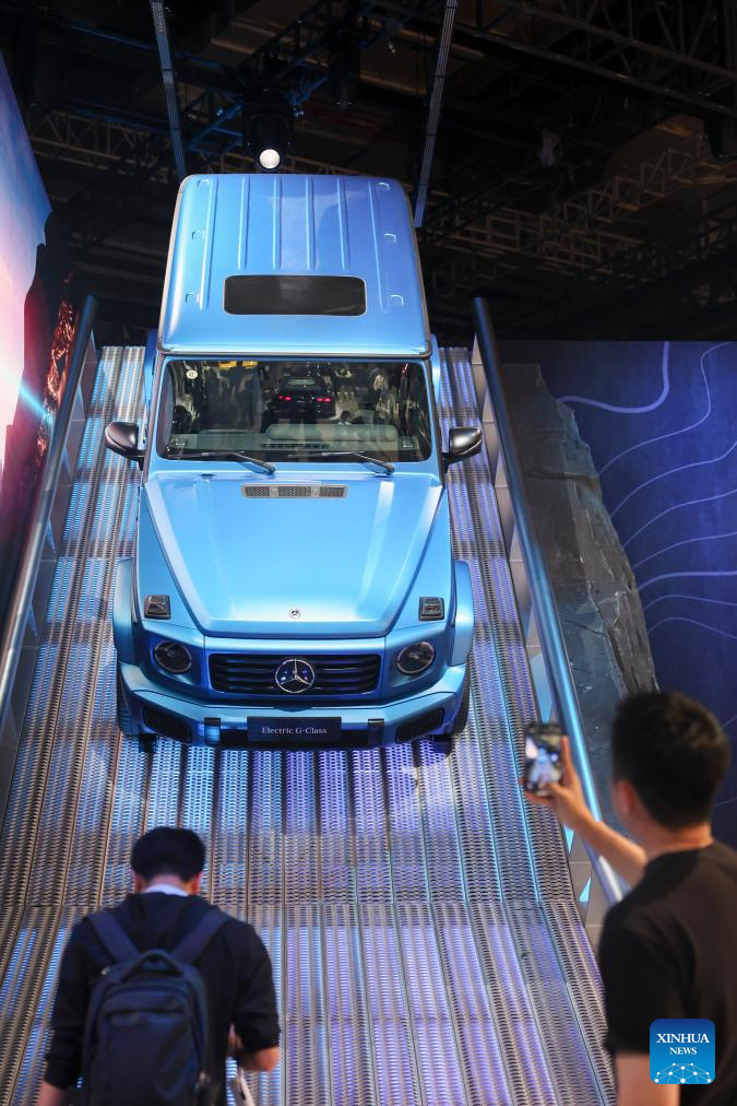 A visitor takes photos of a Mercedes-Benz vehicle during the 21st Shanghai International Automobile Industry Exhibition in east China's Shanghai, April 23, 2025. Themed "Embracing Innovation, Empowering the Future," the exhibition, also known as Auto Shanghai 2025, kicked off here on Wednesday, attracting nearly 1,000 noted enterprises from 26 countries and regions. (Xinhua/Wang Xiang)