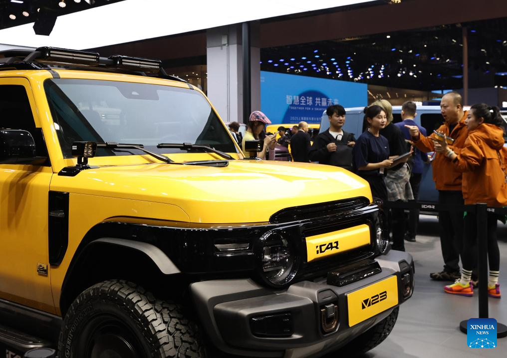 Visitors talk beside an iCAR V23 at the 21st Shanghai International Automobile Industry Exhibition in east China's Shanghai, April 23, 2025. Themed "Embracing Innovation, Empowering the Future," the exhibition, also known as Auto Shanghai 2025, kicked off here on Wednesday, attracting nearly 1,000 noted enterprises from 26 countries and regions. (Xinhua/Fang Zhe)