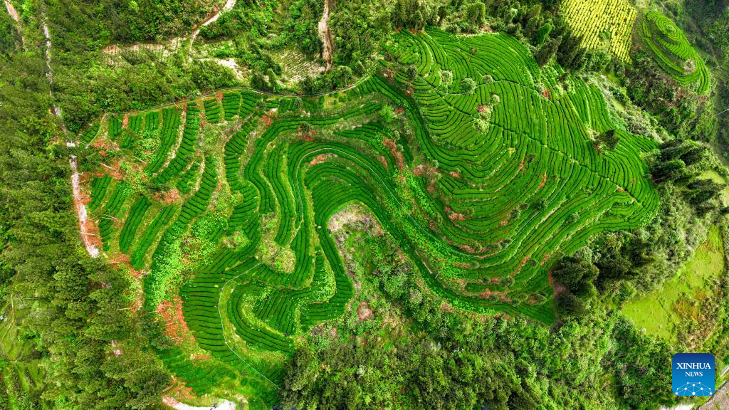 An aerial drone photo shows a tea garden in Jiangkou County of Tongren, southwest China's Guizhou Province, April 16, 2025. (Xinhua/Yang Wenbin)