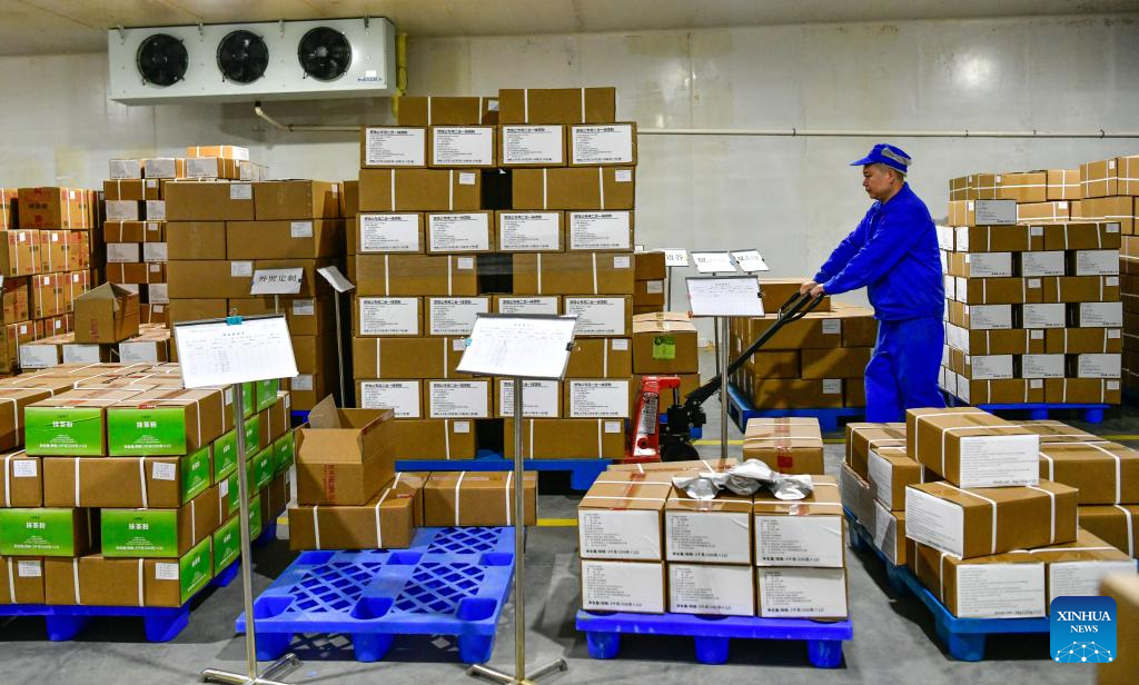 A staff member transports boxes of matcha products at a tea industrial park in Jiangkou County of Tongren, southwest China's Guizhou Province, April 14, 2025. (Xinhua/Yang Wenbin)