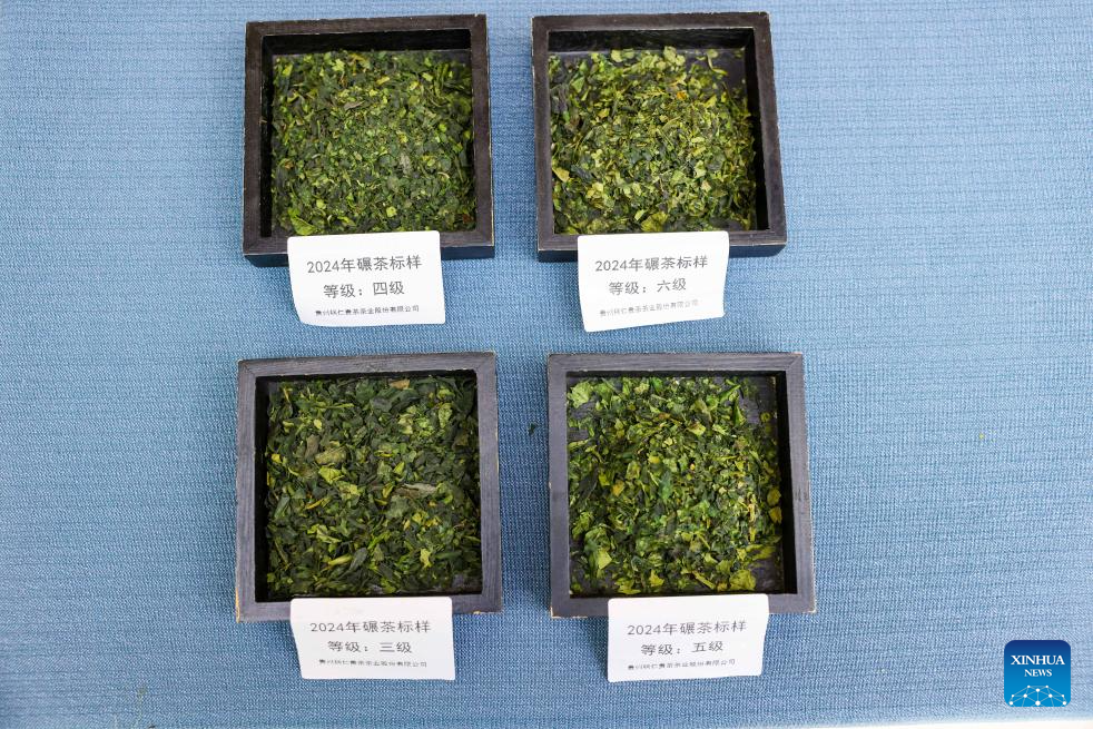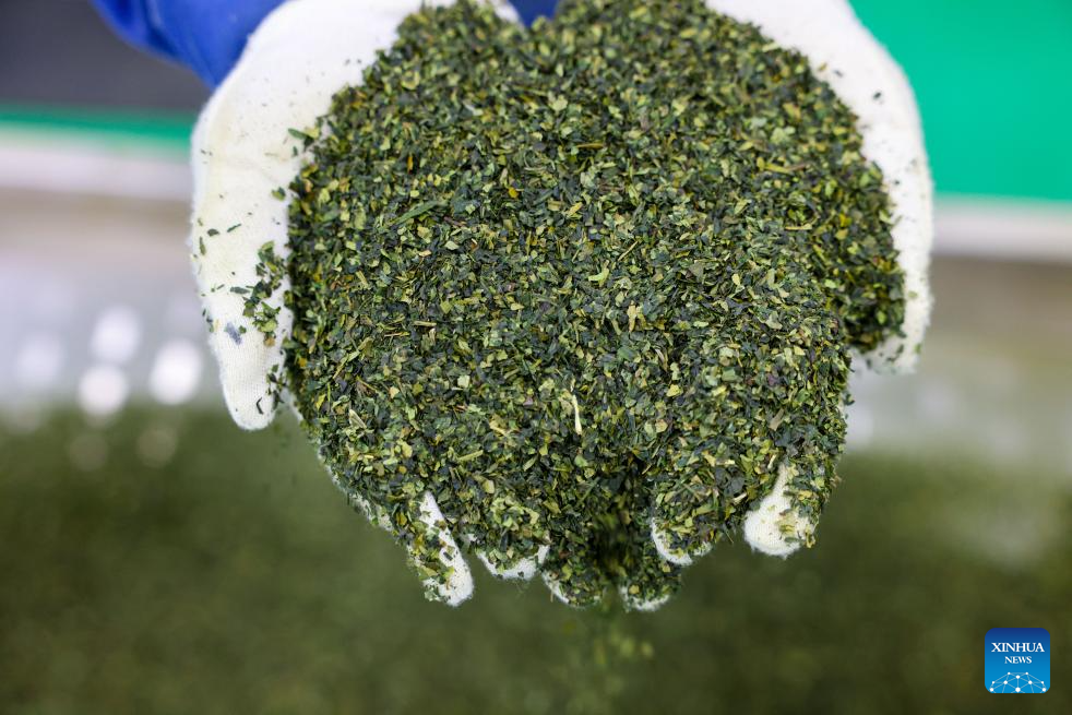 Raw materials for matcha production are on display in a tea industrial park in Jiangkou County of Tongren, southwest China's Guizhou Province, April 14, 2025. (Xinhua/Ou Dongqu)