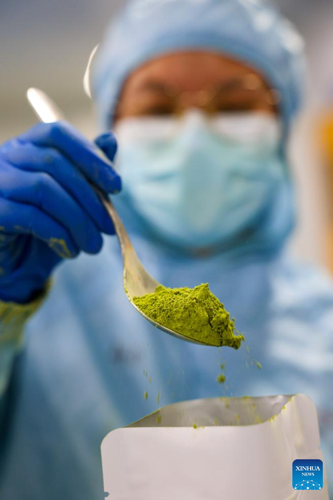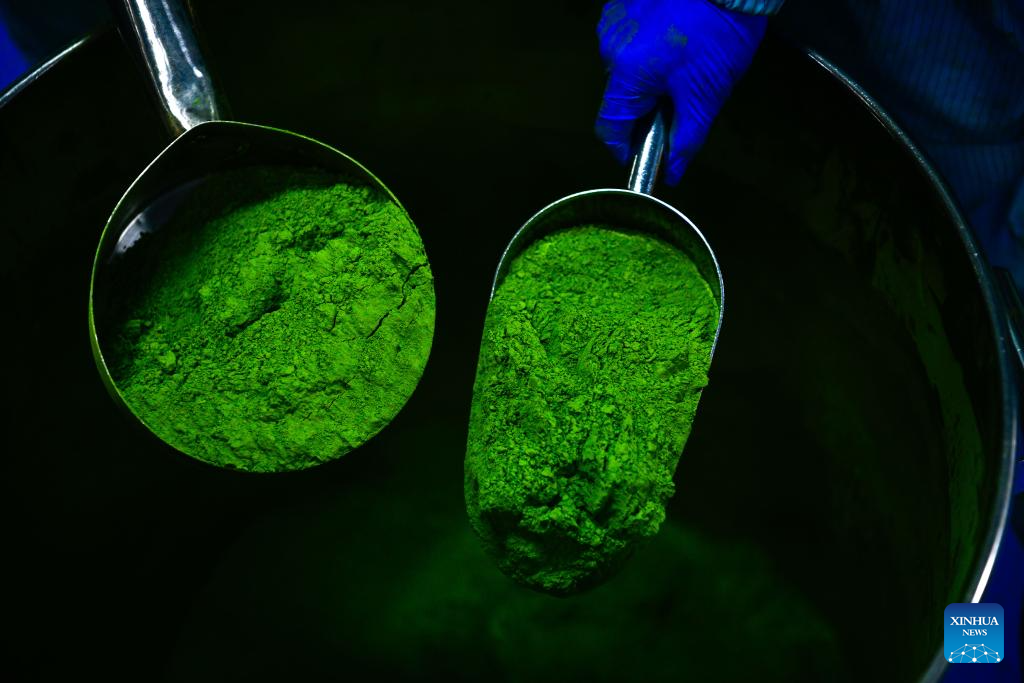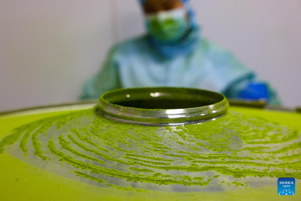 Matcha powder is pictured at a matcha factory in Jiangkou County of Tongren, southwest China's Guizhou Province, April 14, 2025. (Xinhua/Yang Wenbin)