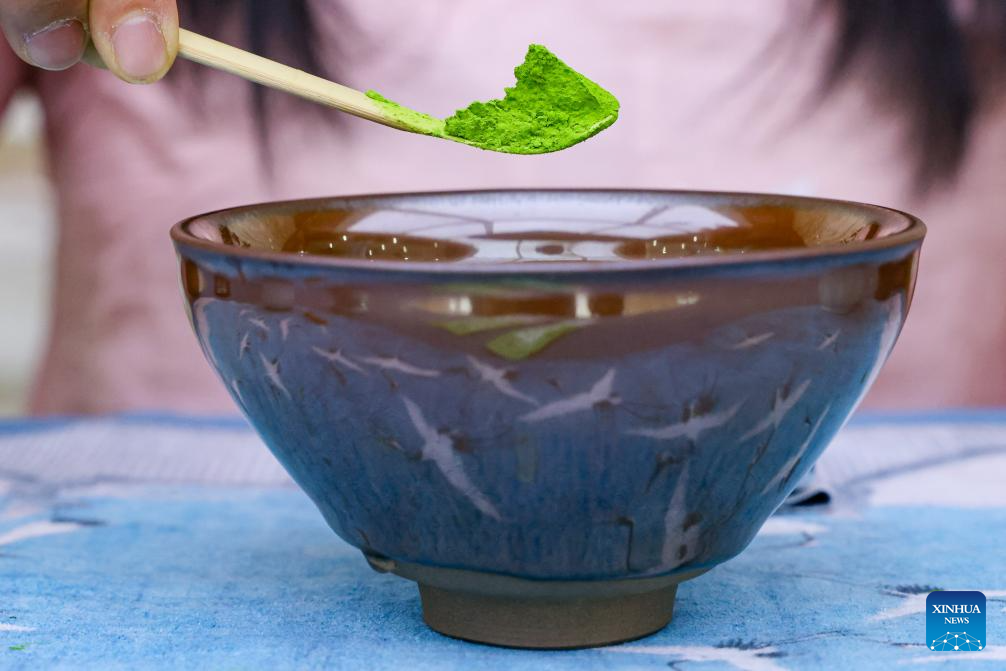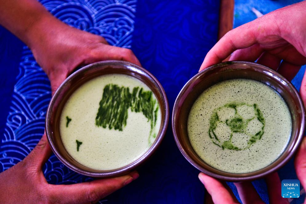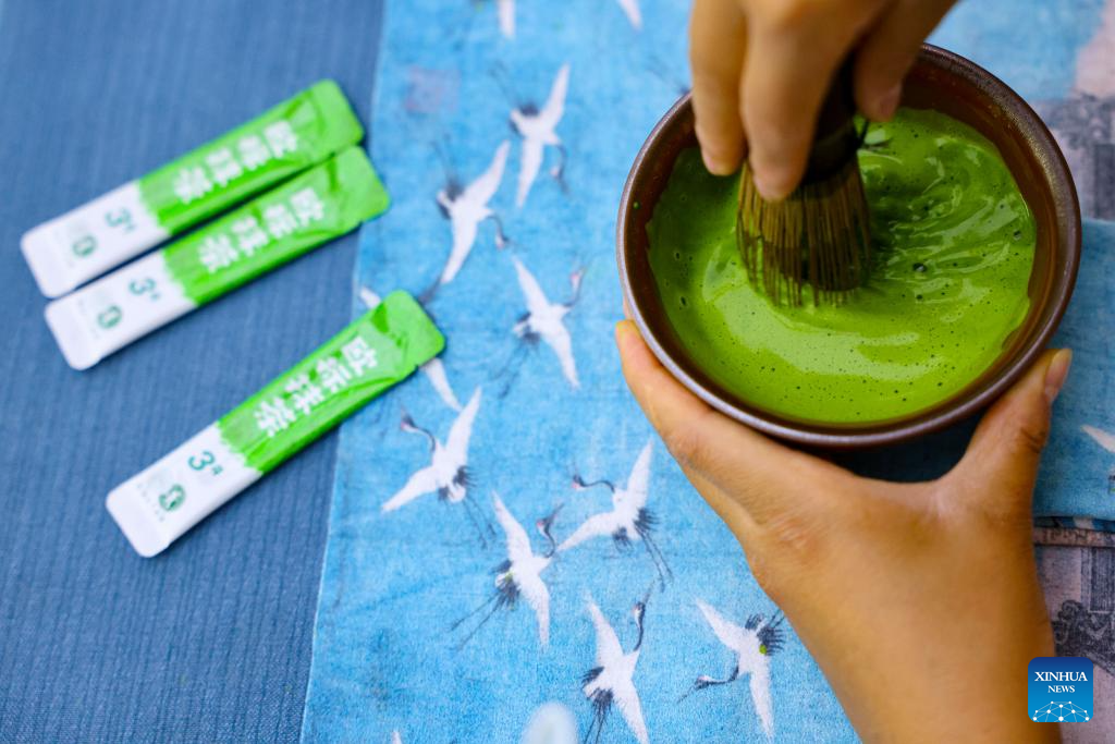 A staff member makes matcha beverage at a tea industrial park in Jiangkou County of Tongren, southwest China's Guizhou Province, April 14, 2025. (Xinhua/Ou Dongqu)