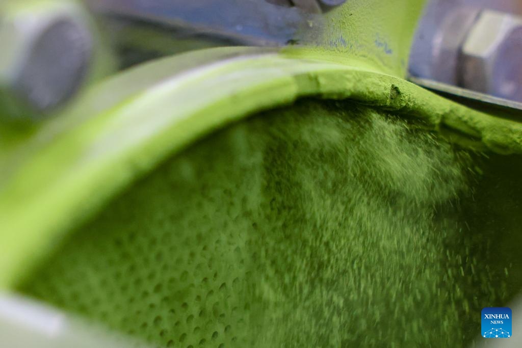 Matcha powder is produced at a tea industrial park in Jiangkou County of Tongren, southwest China's Guizhou Province, April 14, 2025. (Xinhua/Ou Dongqu)