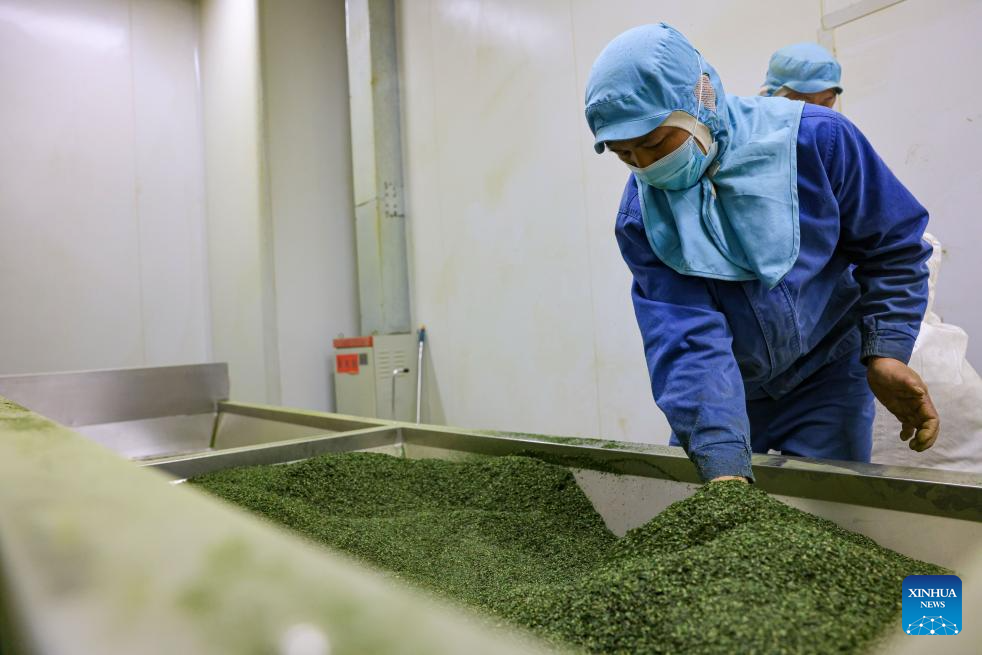 A staff member checks the raw materials for matcha production at a tea industrial park in Jiangkou County of Tongren, southwest China's Guizhou Province, April 14, 2025. (Xinhua/Ou Dongqu)