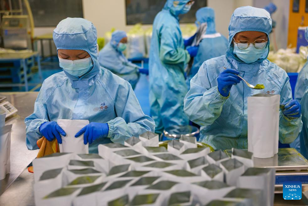 Workers pack matcha powder at a tea industrial park in Jiangkou County of Tongren, southwest China's Guizhou Province, April 14, 2025. (Xinhua/Yang Wenbin)