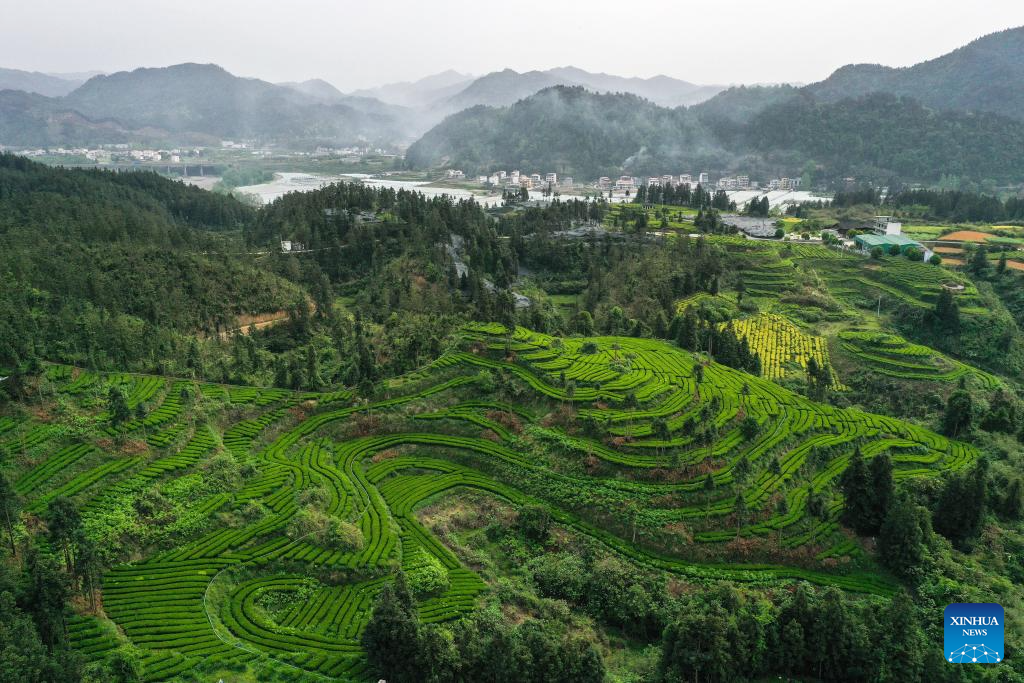 An aerial drone photo shows a tea garden in Jiangkou County of Tongren, southwest China's Guizhou Province, April 16, 2025. (Xinhua/Ou Dongqu)