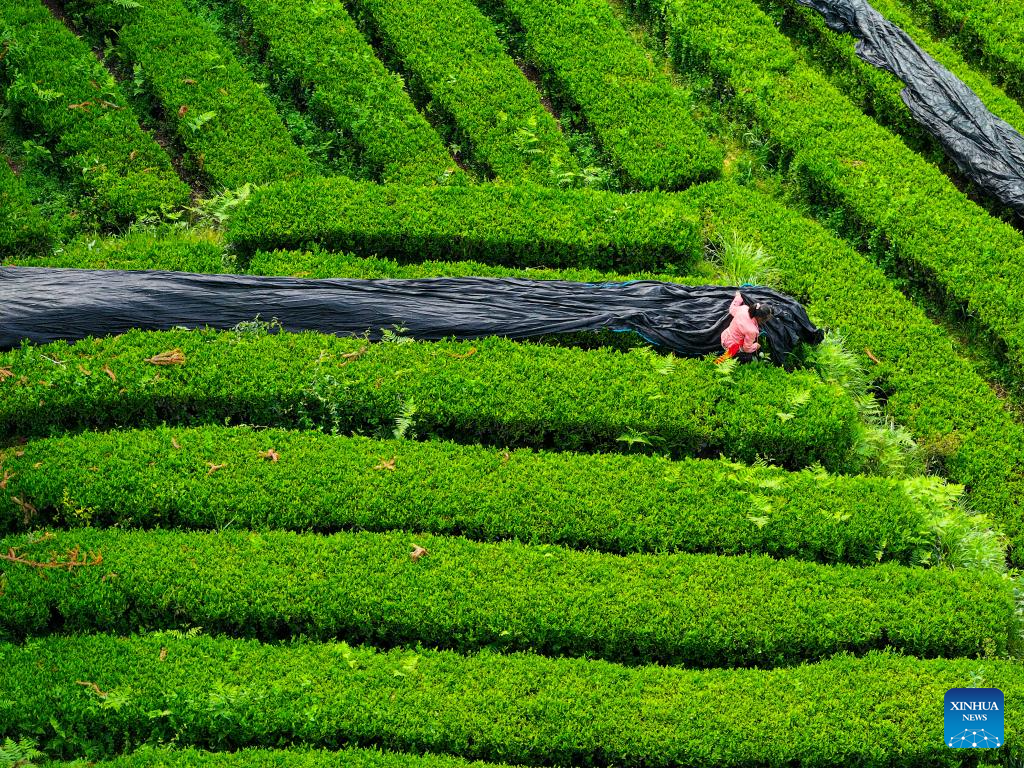 An aerial drone photo shows a farmer applying shading nets at a tea garden in Jiangkou County of Tongren, southwest China's Guizhou Province, April 16, 2025. (Xinhua/Ou Dongqu)