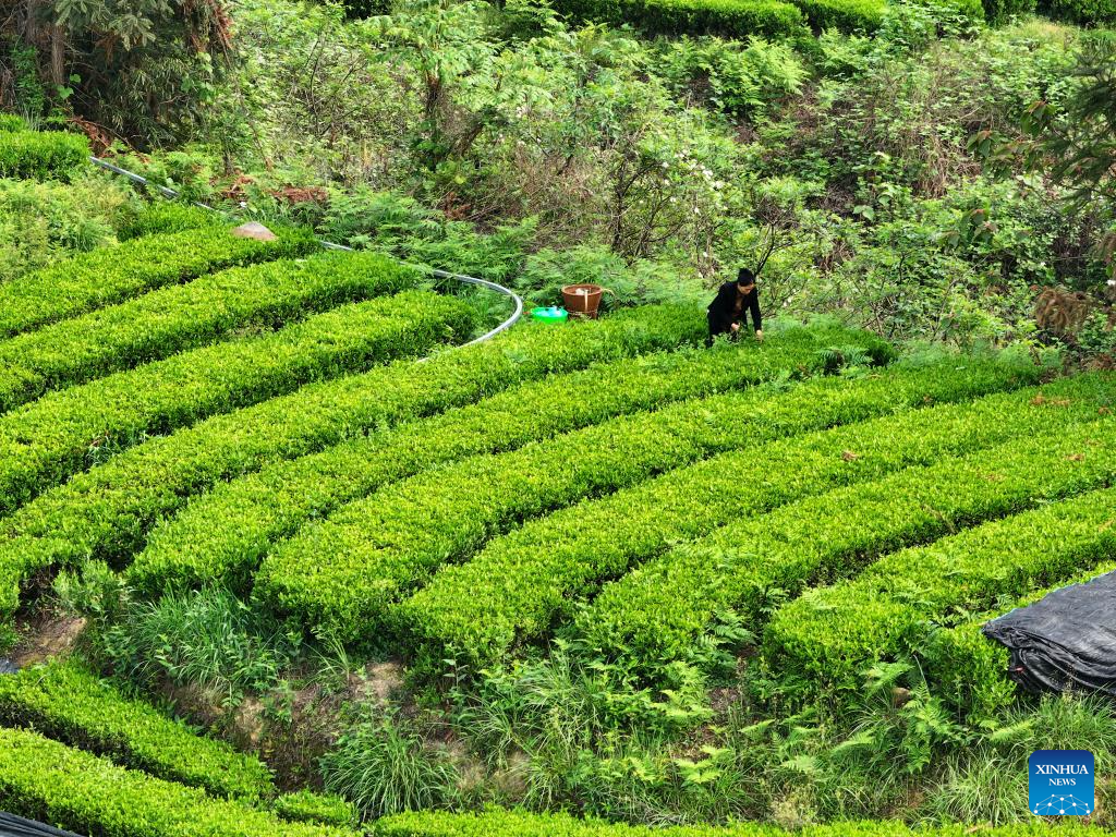 A drone photo shows a farmer weeding at a tea garden in Jiangkou County of Tongren, southwest China's Guizhou Province, April 16, 2025. (Xinhua/Ou Dongqu)