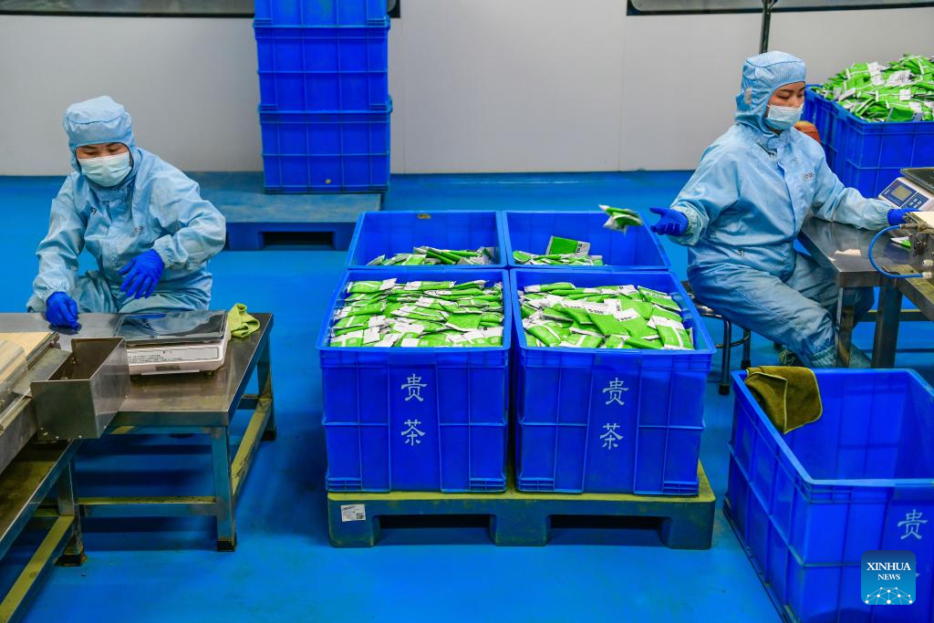 Workers pack matcha powder at a tea industrial park in Jiangkou County of Tongren, southwest China's Guizhou Province, April 14, 2025. (Xinhua/Ou Dongqu)