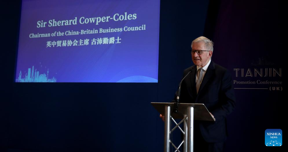 Sherard Cowper-Coles, chair of the China-Britain Business Council, delivers a speech at an investment and business promotion event for China's northern port city of Tianjin, held in London, Britain, on April 24, 2025. An investment and business promotion event for China's northern port city of Tianjin was held in central London on Thursday, with enthusiastic participation from both Chinese and British stakeholders. (Xinhua/Li Ying)
