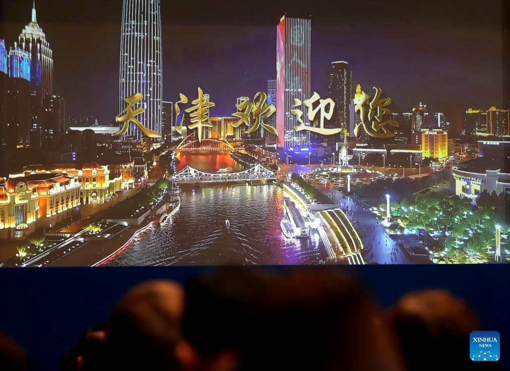 People watch a promotion video of China's northern port city of Tianjin at an investment and business promotion event for Tianjin, held in London, Britain, on April 24, 2025. An investment and business promotion event for China's northern port city of Tianjin was held in central London on Thursday, with enthusiastic participation from both Chinese and British stakeholders. (Xinhua/Li Ying)
