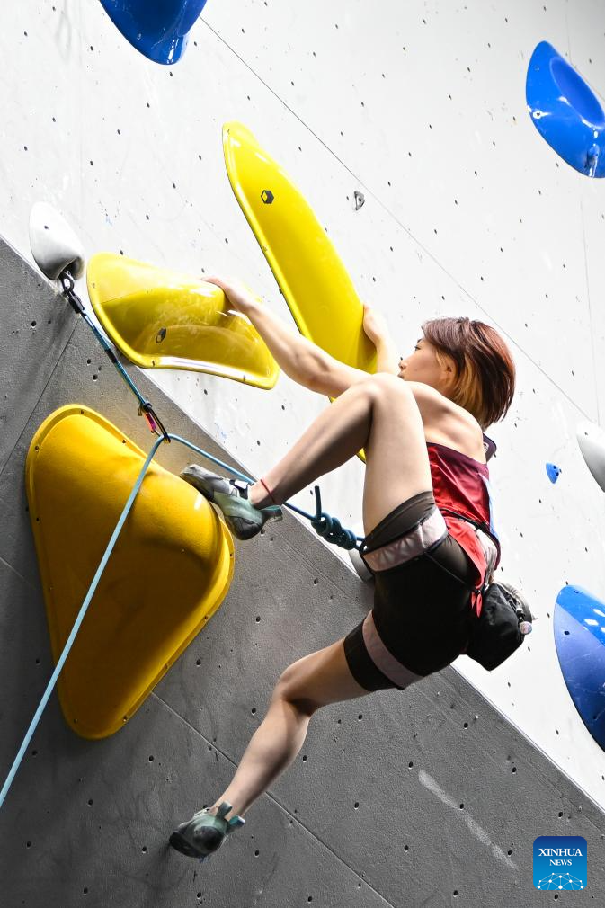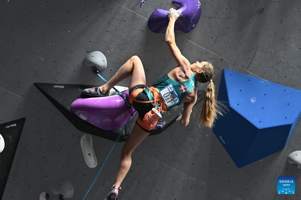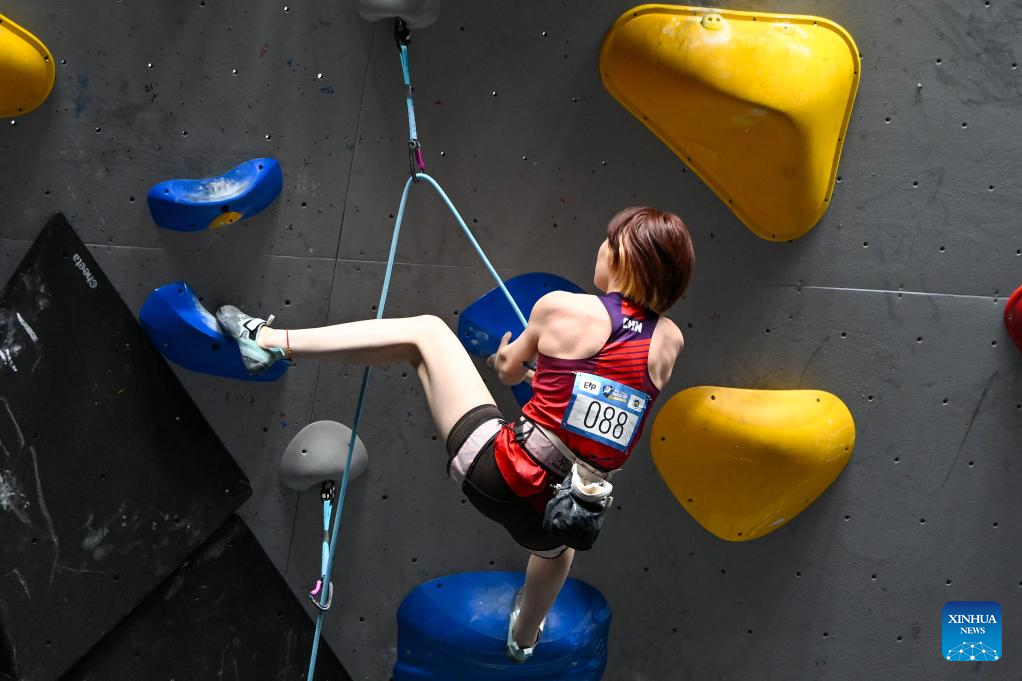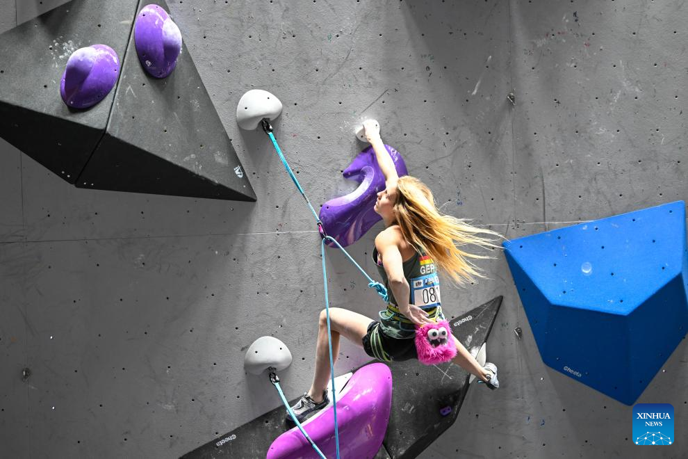 Roxana Wienand of Germany competes during the women's lead qualification at the IFSC World Cup Wujiang 2025 in Suzhou, east China's Jiangsu Province, April 25, 2025. (Photo by Wang Xuzhong/Xinhua)